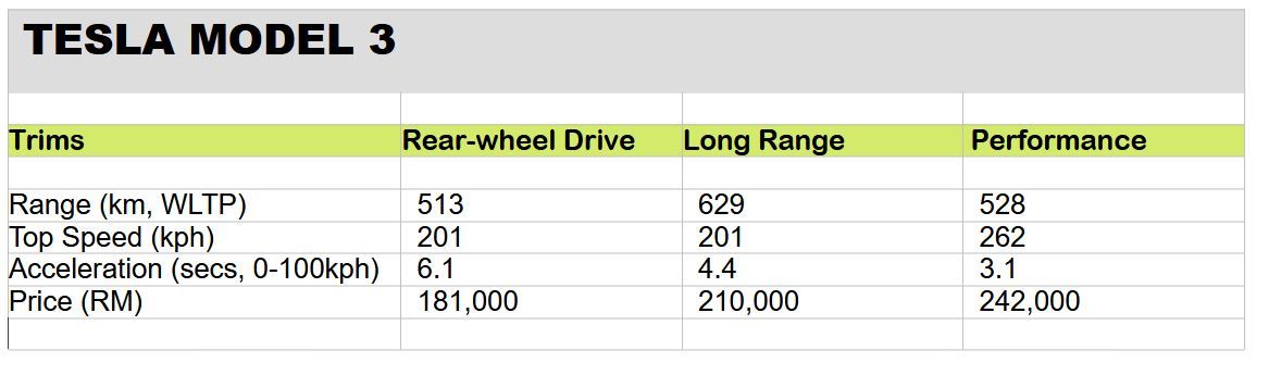 The Model 3 Performance is priced at RM242,000. Two cheaper versions are also on sale: Rear-Wheel Drive at RM189,000 and Long Range at RM218,000.