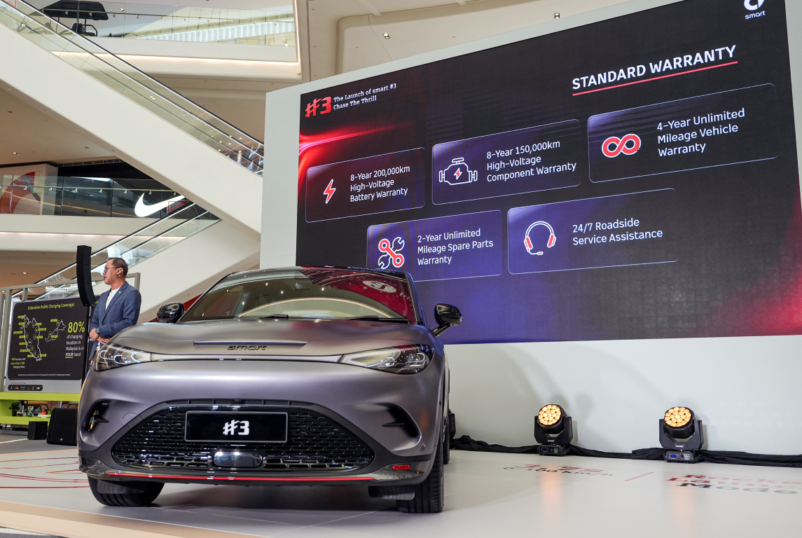 Smart Malaysia offers an 8-year 200,000km high-voltage battery warranty, an 8-year 150,000km high-voltage component warranty, a 4-year unlimited mileage vehicle warranty, a 2-year unlimited mileage spare parts warranty, 24/7 roadside service assistance, a complimentary smartCharge Home Charger with a 2-year warranty, a complimentary accessories package with six items worth RM2,500, a Vehicle to Load (V2L) Adaptor with a 2-year warranty, and complimentary 5-year Internet data totalling 60GB.