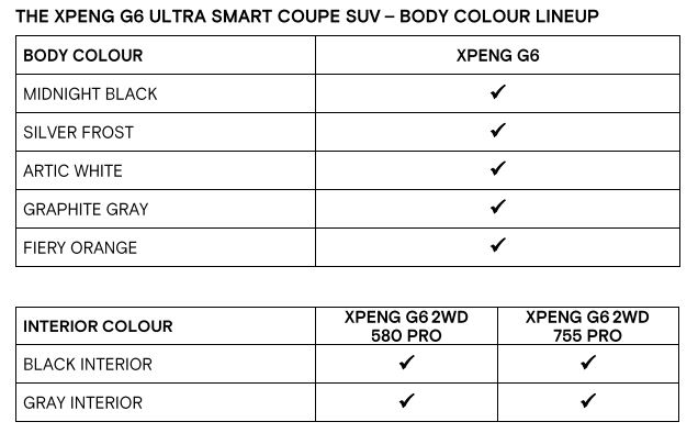 The XPeng G6 comes fully imported from China and is available in five exterior colours: Midnight Black, Silver Frost, Artie White, Graphite Gray, and Fiery Orange.