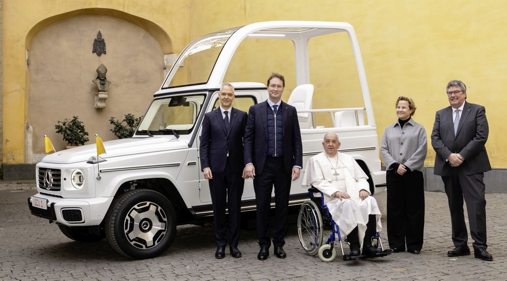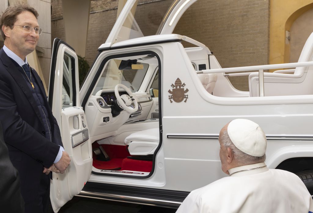 The handmade vehicle, based on the new electric G-Class, was presented by Mercedes-Benz CEO Ola Källenius and key team members during a ceremony at the Vatican.
