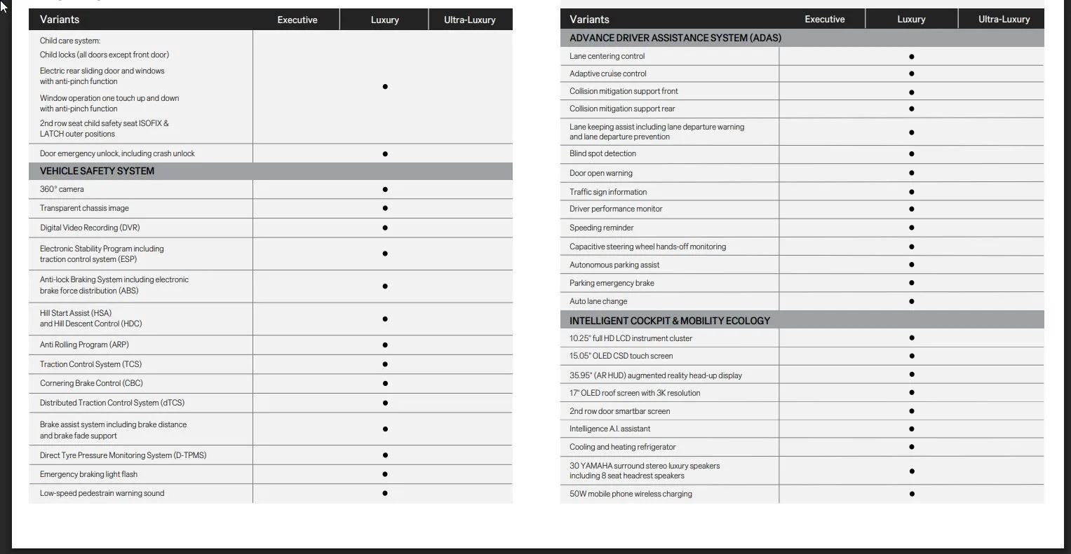 Inside, the minimalist cabin features premium materials, including soft-touch surfaces and rose gold accents. Standard amenities include a panoramic sunroof, customisable ambient lighting, and a 14.6-inch central display with wireless Apple CarPlay and Android Auto. A 13-speaker Yamaha sound system, augmented reality head-up display (AR-HUD), and a 50W wireless charger enhance the interior experience.