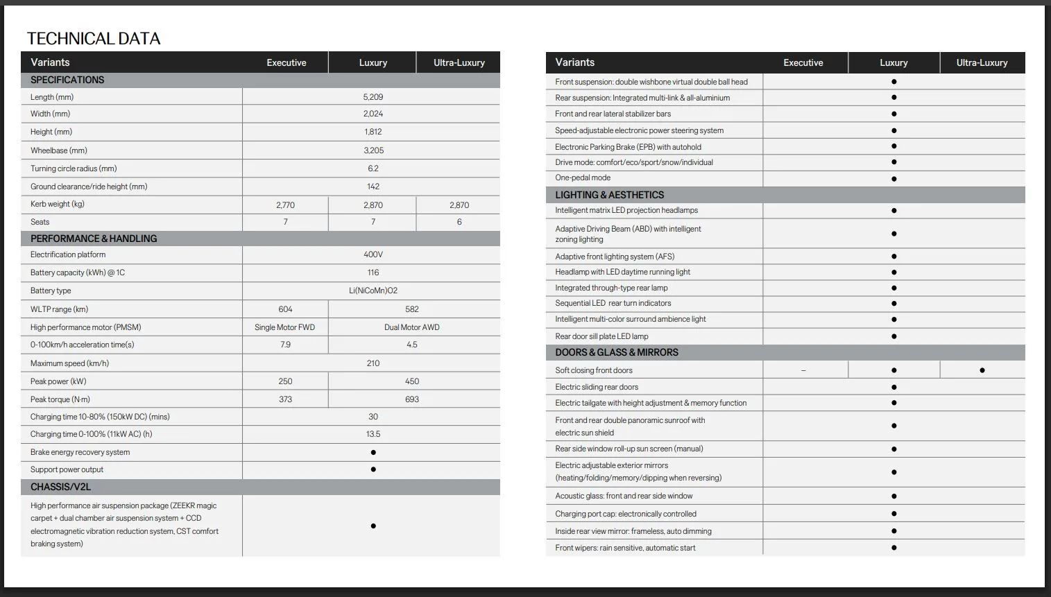 The 009 is a luxury electric MPV featuring dual electric motors delivering 450 kW of power and 693 Nm of torque, allowing it to accelerate from 0 to 100kph in 4.5 seconds. Equipped with a 116 kWh battery, it offers a WLTP range of 582 km and supports fast charging from 10% to 80% in 30 minutes.