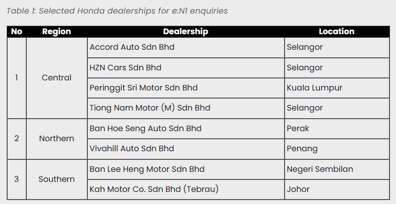 Honda Malaysia has appointed eight dealerships across three regions to specifically handle customer enquiries about the e:N1 (see table below).