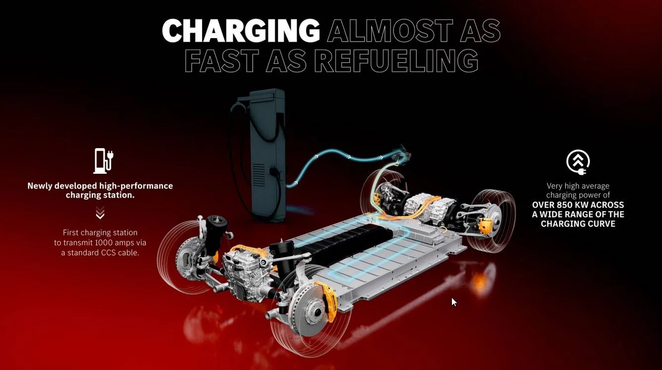 Operating at over 800V, the battery accepts charging rates above 850kW, allowing a 400km range to be replenished in about five minutes.
