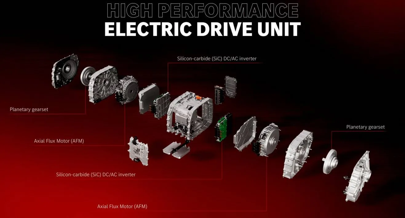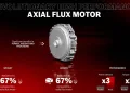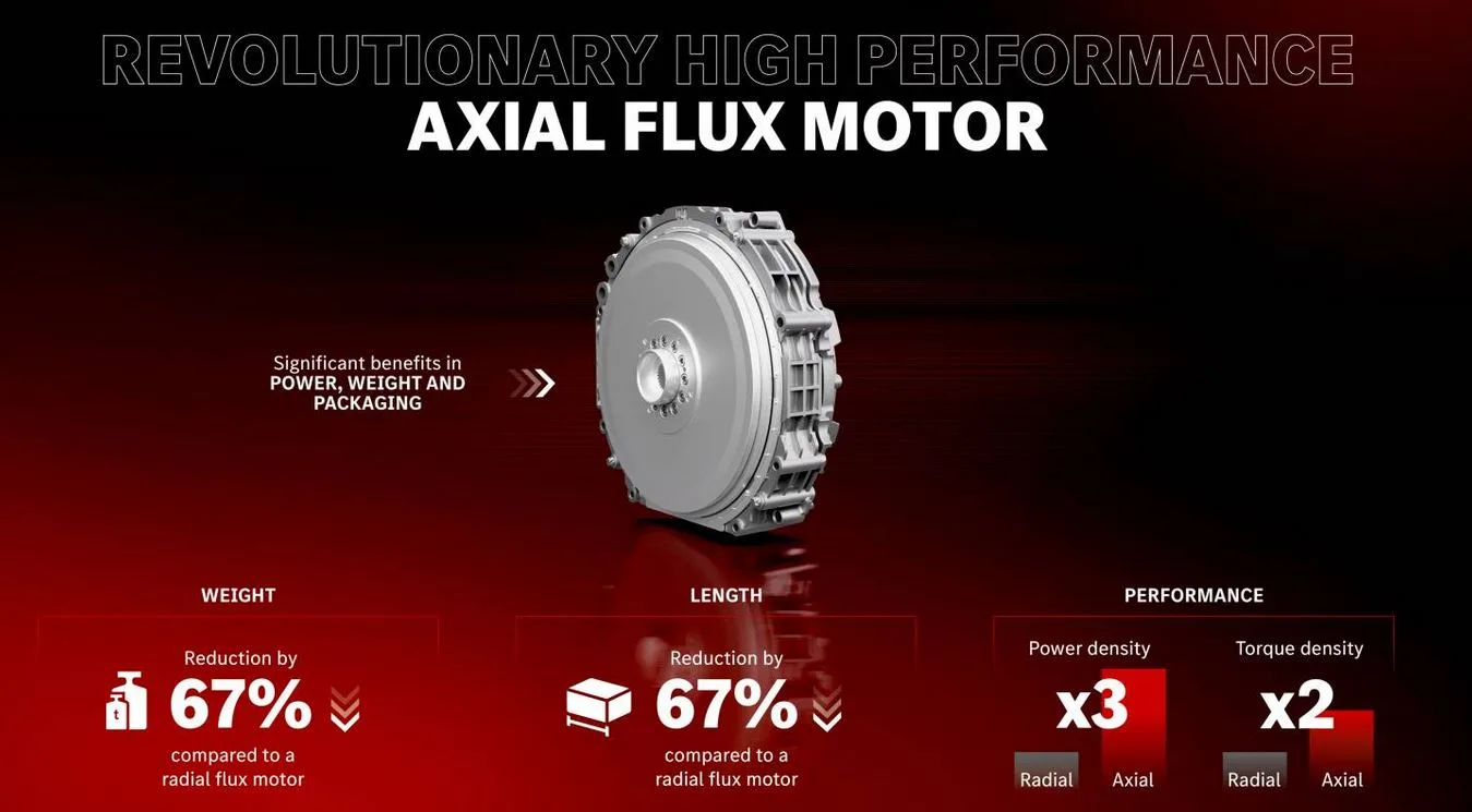 Developed in partnership with British subsidiary Yasa, the vehicle employs three axial-flux motors that are markedly smaller and lighter than conventional radial-flux units, while delivering three times the power density.