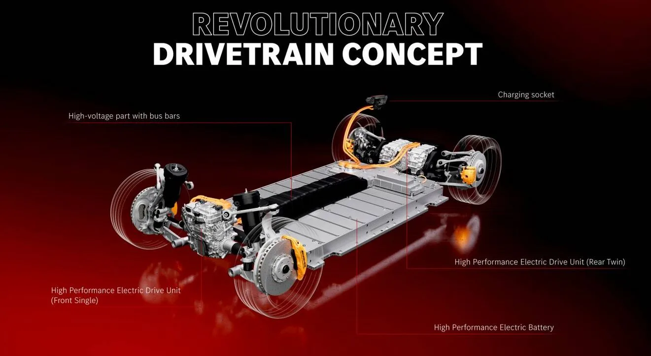The powertrain is split between two High Performance Electric Drive Units (HP.EDUs).