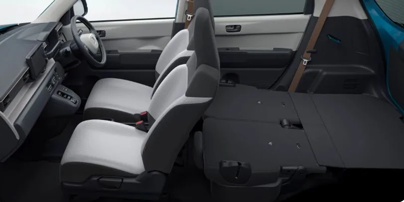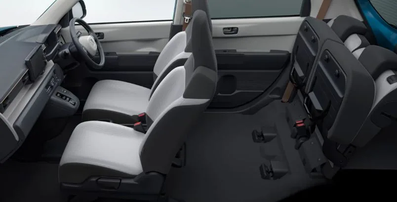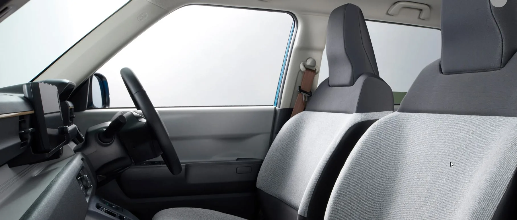 The exterior retains the N-ONE’s silhouette but swaps its grille for a smooth, black panel housing dual charging ports and adds streamlined bumpers with clear-lens taillights.
