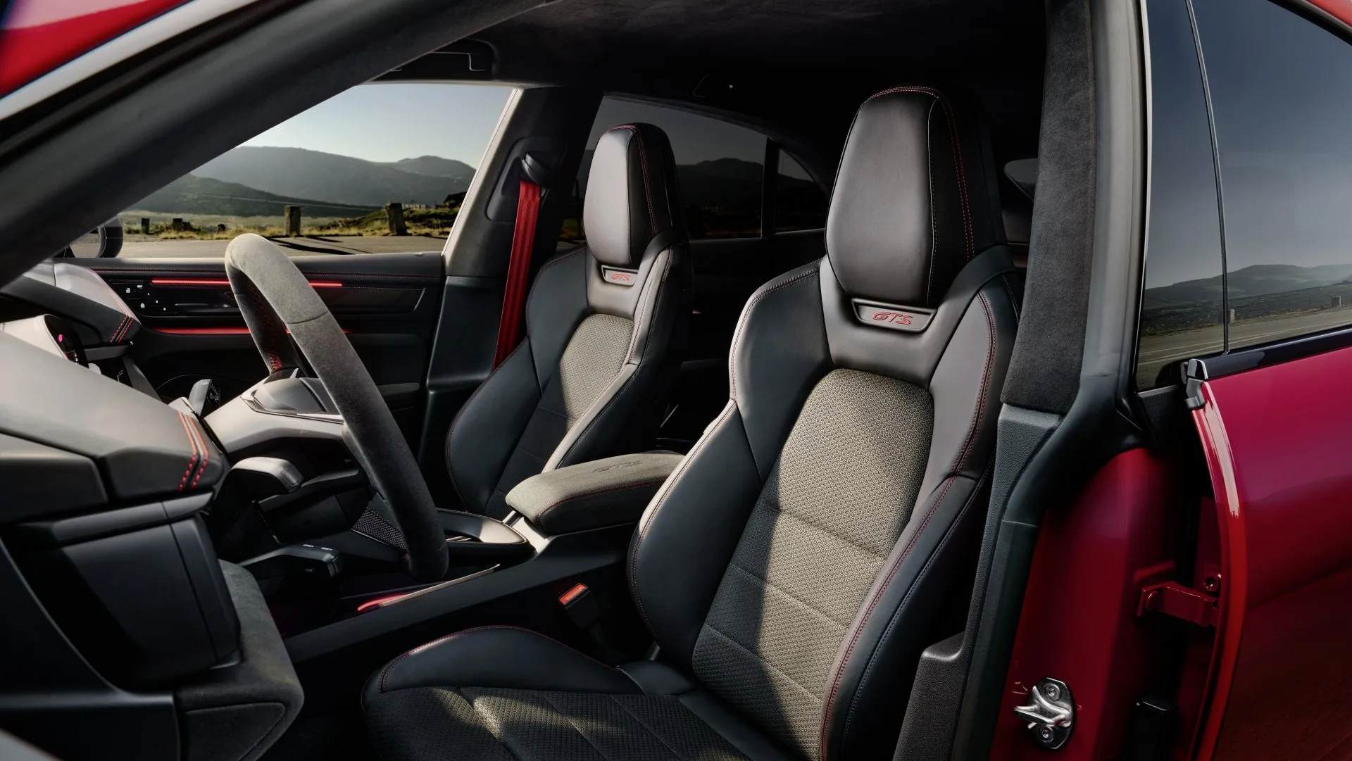 Inside, the GTS treatment brings extended Race-Tex upholstery with black smooth-leather elements.