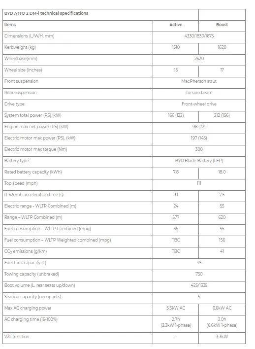 The Atto 2 DM-i will come in two flavours. The Active version pairs a 7.8kWh Blade Battery with BYD’s Xiaoyun 1.5-litre petrol engine and dual-motor hybrid system, good for 166PS and a claimed WLTP electric-only range of 39km. Combined range is quoted at up to 929km on a full tank and full charge.