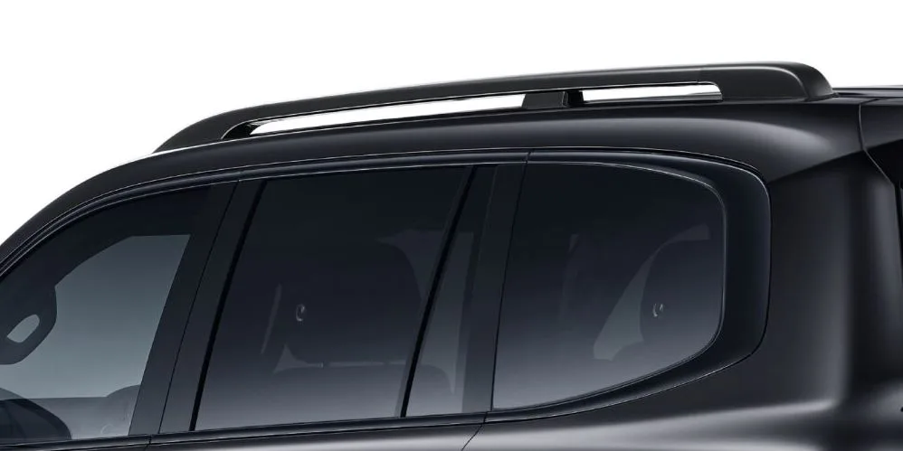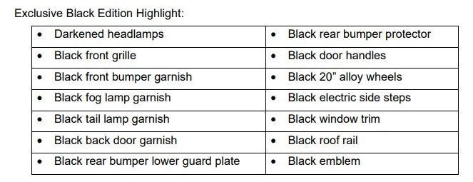 Its changes are visual and comprehensive: darkened headlamps, a black grille, bumper and fog-lamp garnishes, black tail-lamp and back-door trims, a black rear bumper protector and lower guard plate, black door handles and window surrounds, black roof rails, black electric side steps and 20-inch black alloy wheels.
