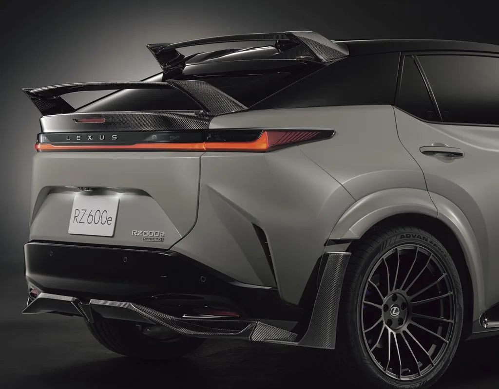Lexus said overall vehicle height drops by 20mm versus the base RZ 550e “F SPORT” to reduce drag and improve stability across a wider range of speeds.