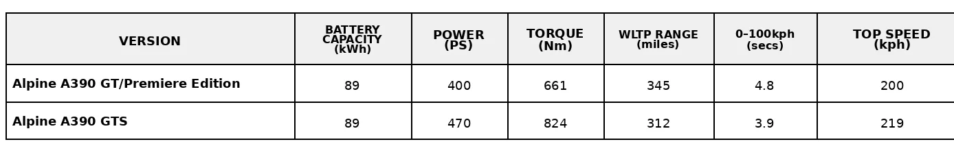 All versions use an 89kWh battery. Alpine quotes up to 555km WLTP range for the GT and Premiere Edition (subject to final homologation), while the higher-output GTS is rated at 502km WLTP.
