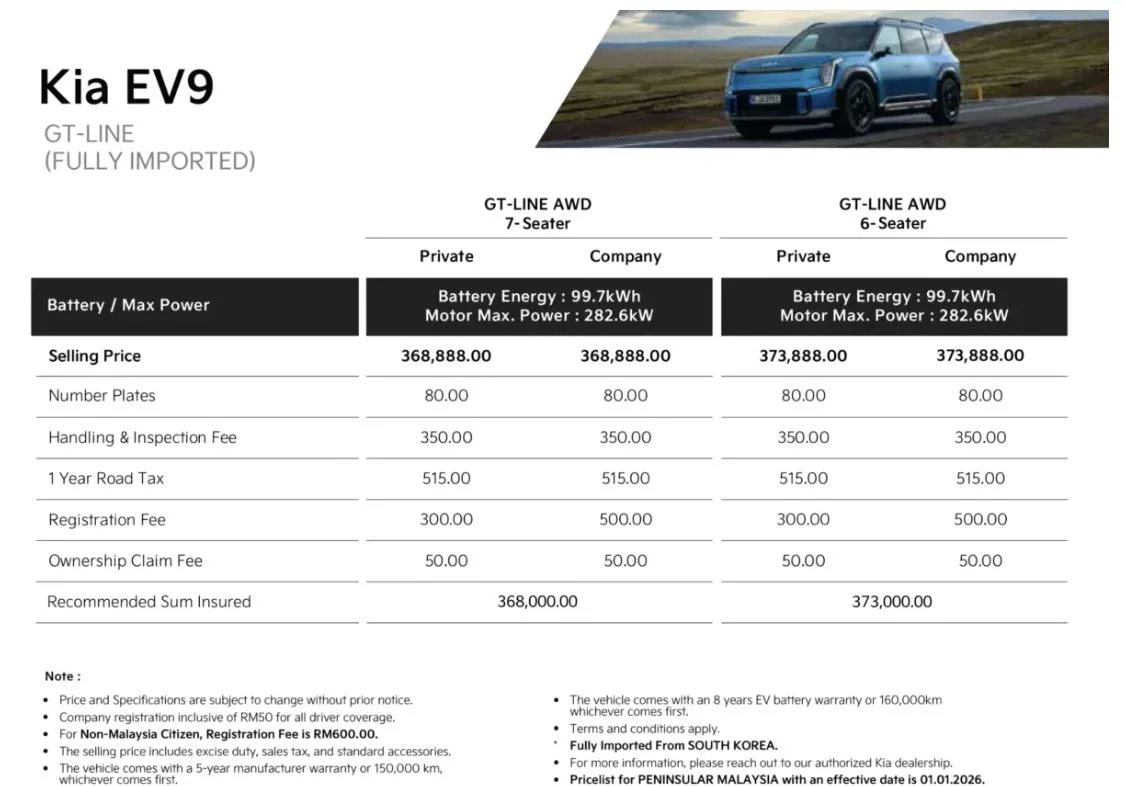 From Jan 1, 2026, KSM has assumed responsibility for local operations and introduced revised pricing across its three-vehicle line-up: the EV9, Sportage and Carnival.