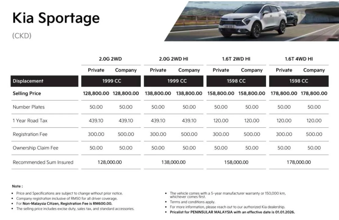 The Sportage range now opens at RM128,800, a reduction of about RM18,200 compared with its earlier entry point. The larger cut applies to the Carnival, where the 2.2-litre diesel 8-seater is now priced at around RM193,000, a drop of about RM52,888 versus previous level. On-the-road pricing without insurance is listed from RM129,639 for the Sportage and RM193,961 for the Carnival 8-seater.