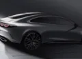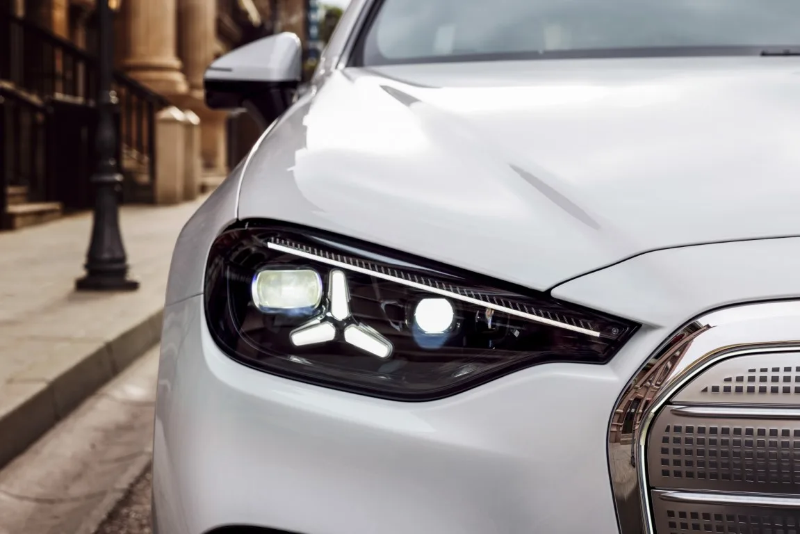 Visually, it looks less like a conservative three-box saloon and more like a sleek electric four-door with a coupé-like roofline. Up front, an illuminated grille carries the central star and star-themed lighting signatures, while the rear uses four round star-design taillights to reinforce the point.