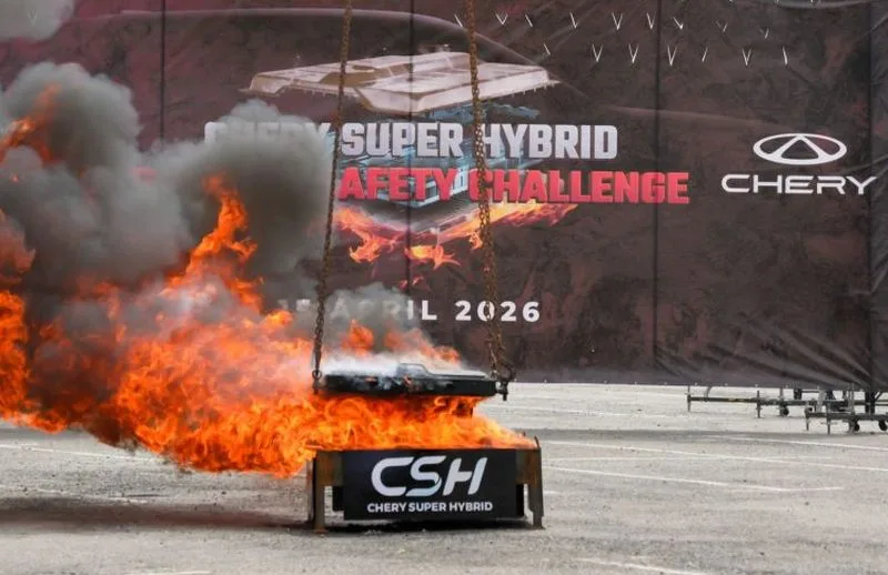 The battery — the same unit inside the Tiggo 7 and Tiggo 8 PHEV — took a direct flame for eighty seconds. No explosion. No runaway fire. Just a battery that looked unbothered.